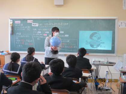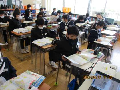4月27日(火) 1年生社会科の授業 公開日 2021/04/27 更新日 2021/04/27 できごと 1年生社会科の授業。「世界に位置を友達に知らせるにはどうしたらよいだろうか?」こんなテーマでいろいろ考えました。 地球儀や、PC、地図帳などを駆使して、「緯度」や「経度」を習いました。 どっちが「緯度」で、どっちが「経度」? 縦の線がどっちだっけ? 混乱しないようによく整理しておく必要がありそうす。