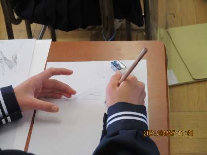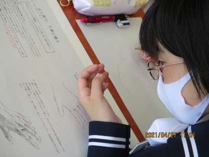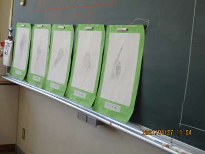 4月27日(火) 1年生美術の授業 公開日 2021/04/27 更新日 2021/04/27 できごと 1年生美術の授業では、「よく見て、丁寧にかく」学習をしてました。 黒板には、「じっくり観察するには、3秒見て、3秒描く」と描かれていました。 先輩の描いた作品を見ながらイメージを広げてから、自分の手のポーズを決めて、じっくり見ながら、描き始めていました。