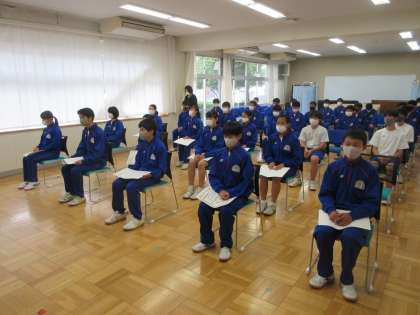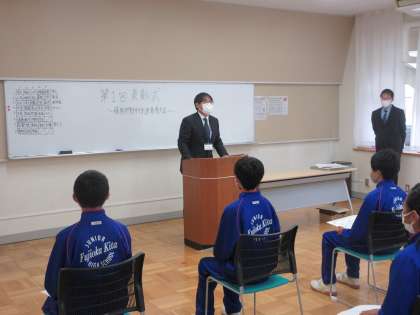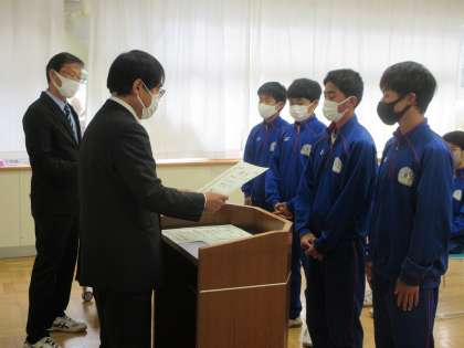 第1回 表彰式 公開日 2021/04/28 更新日 2021/04/28 できごと 中体連春季大会の結果を経て、昼休みに西会議室にて、第1回の表彰式を行いました。密を避けるため、今回は陸上部、剣道部、体操部、サッカー部、男子ソフトテニス部の約40名の生徒の活躍を表彰しました。スポーツマンらしいテキパキとした動きで、校長先生より誇らしげに賞状を受け取りました。県大会や夏季大会での更なる活躍を期待しています。