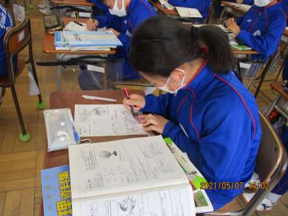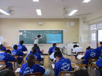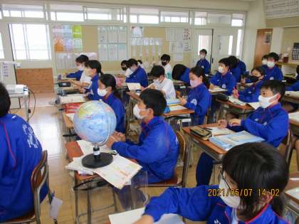 地理の学習。地球儀や地図について学習しています。 世界の略地図を描いていました。