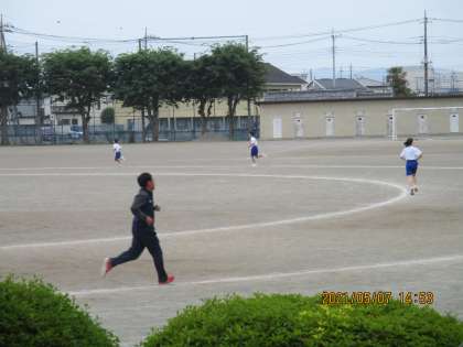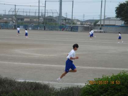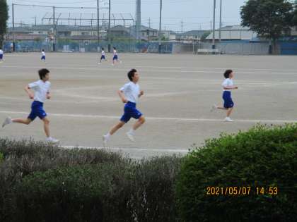 5月7日(金) 3年生体育の授業 公開日 2021/05/07 更新日 2021/05/07 できごと 3年生 体育の授業です。 今にも雨が降り出しそうな天気(少し小雨が降り出したか?)の中。 スポーツテストの「持久走」の計測が行われていました。 おやおや? よく見ると、どうやら担任の先生も生徒と一緒に走っているようです。(数学の先生のはずですが。) 楽しさも、苦しさも生徒と分かち合おうとする先生の姿はいいですね。生徒を思う心を感じます。