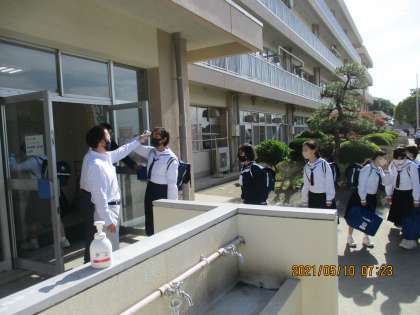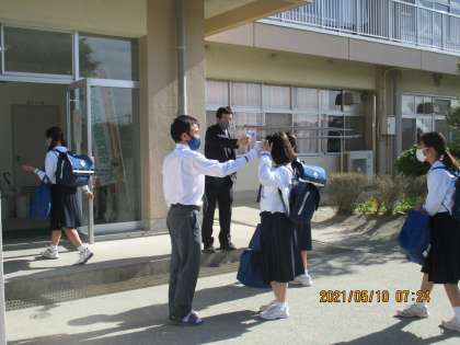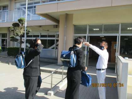 新型コロナウイルス感染症の感染拡大による予防対策の一環として、5月6日木曜日から生徒の玄関での検温を始めています。7時40分から学年の先生方が立ち、非接触型体温計を使って体温の計測を始めています。背板は原則家でも検温をしてきていますが、学校に感染症を持ち込まないようにダブルチェックを行っています。、