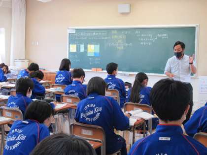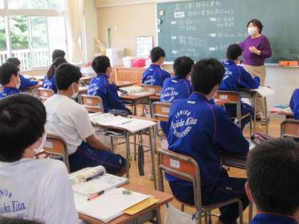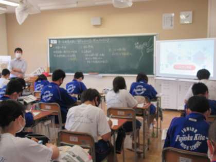3年生の数学では、1つの多項式を単項式や多項式の積での表し方について、マグネットのタイルをヒントに解決を図っていました(上)。社会では、第一次世界大戦と日本の関わりについて、提示資料や手元の資料集などを活用しながら考えていました(中)。理科では、物体の運動について生徒の様々な予想に基づいて意見交流をしていました(下)。どのクラスも、先生や友達の説明をよく聞き、考えを述べ、積極的な姿勢で取り組む姿が見られました。