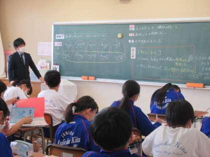 1年生の英語では、「英語の読み方にはきまりがあるのか」をめあてに、身近な英語(hopとhopeなど)を発音したり聞いたりし、比較しながら考えました。生徒は積極的に発言し、友達の発表を聞いて自分も試し、きまりを見つけていきました。2年生の社会では、日本と世界の国々の人口の特色について、人口ミラミッドを使いながら考えていました。高齢化が進む国や出生率の高い国などのピラミッドを知り、今後世界の人口がどう変化していくのかを真剣に考えていました。