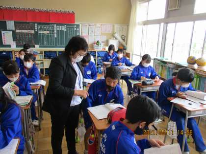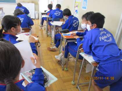 5月11日(火) 2年英語の授業 公開日 2021/05/11 更新日 2021/05/11 できごと 2年英語の授業では、場所をあらわす前置詞を使ったスキットの台本を作りました。 教科書の文を参考にしたり、黒板の例文を見たり、周りの友達を相談しながら進めていました。