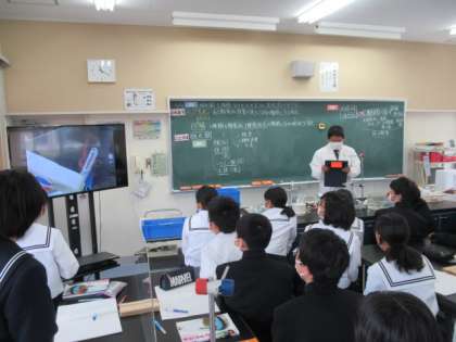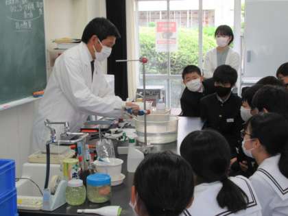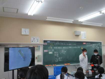 5月12日(水) 2年生の理科(1) 公開日 2021/05/12 更新日 2021/05/12 できごと 2年生の理科では、“酸化銀を加熱するとどのように変化するか?”をめあてに、これまでの学習を生かして予想を立て、実験に臨みました。今日の実験は、先生による提示でしたが、離れた場所の生徒も実験の手元や変化に気付けるようにと、タブレットを使ってテレビ画面にも映し出されていました。