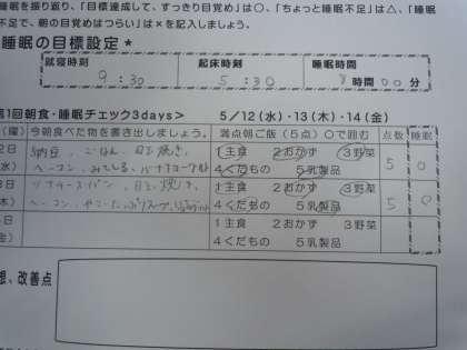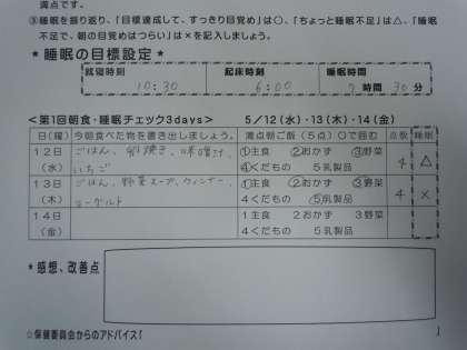 2年生は、睡眠時間の設定が1年生より少し遅いようです。中学校の生活に慣れてきたのでしょう。睡眠が△、×だった人に聞いてみると、朝がつらくて起きられないといっていました。生活を振り返り、改善できるといいですね。