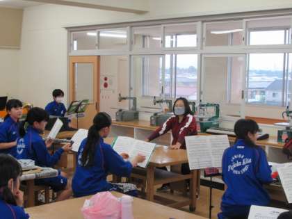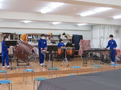 吹奏学部は、打楽器パートと金管・木管楽器パートに分かれて練習していました。管楽器パートでは、良い音を出すための吹き方などを楽器ごとに教わり、練習していました。窓を開放し、少人数で吹くなどの感染症対策をとっての取組が続けられています(上・下)。