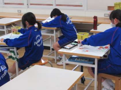 美術部は、各自のテーマに基づいて制作に取り組んでいました。資料を見て対象の形や色をよく調べたり、色作りを入念に行ったりと、良い作品にするために意欲的に頑張っていました。