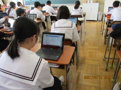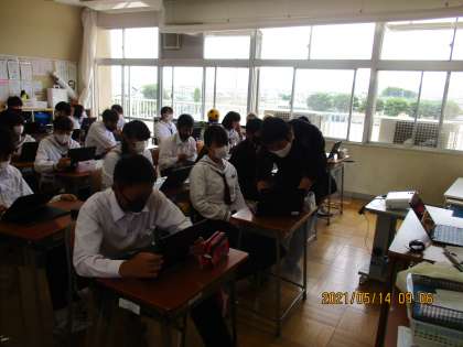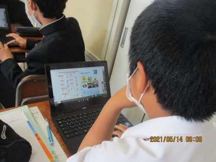 5月14日(金) 2年生英語の授業 公開日 2021/05/14 更新日 2021/05/14 できごと 2年生の英語の時間には、デジタル教科書の使い方を学びました。 初めての今日は、まずは繋ぎ方から。 学びの道具として有効に活用してほしいと思います。