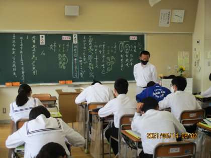 5月14日(金) 3年生国語の授業 公開日 2021/05/14 更新日 2021/05/14 できごと 3年生国語の授業。 漢文の学習です。「訓読文は書き下し文に、書き下し文は訓読文に」 基本を教わり、それをもとに各自でじっくり考えていました。