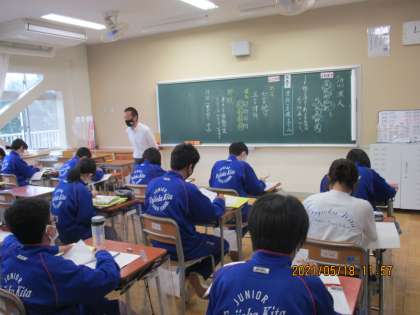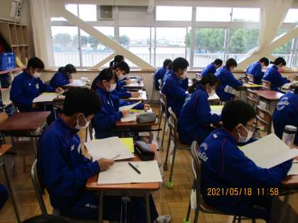 5月18日(火) 3年生国語の授業 公開日 2021/05/18 更新日 2021/05/18 できごと 3年生国語の授業の様子です。 漢詩の基礎について学んでいます。 形式は「七言絶句」 「五言律詩」 構成 押韻 対句 ・・・ しっかり学んでいました。