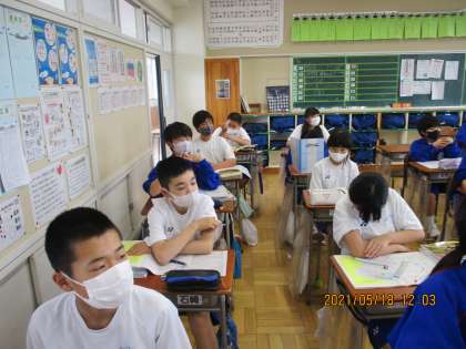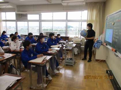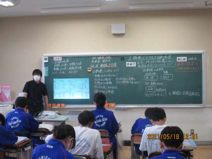 5月18日(火) 1年生社会科の授業 公開日 2021/05/18 更新日 2021/05/18 できごと 1年生社会科の授業の様子です。 なぜ、地球では位置によって時間が変わっていくんだろう? 時差の求め方など、頭に汗をかきながらしっかり考えていました。