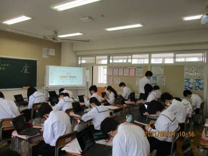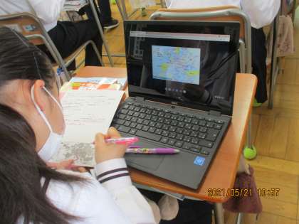 5月21日(金) 3年社会科の授業 公開日 2021/05/21 更新日 2021/05/21 できごと 3年社会科の授業の様子です。 「第二次世界大戦は、どのように始まったのだろうか?」 今日は、一人1台PCを机上に置いて、調べ学習をしながら進めていました。 PCは大事な資料集です。