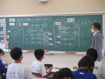5月21日(金) 1年生数学の授業 公開日 2021/05/21 更新日 2021/05/21 できごと 1年生数学の授業の様子です。 符号のついた数の乗法のやり方は教わりました。 では、除法の計算はどのようにするのでしょうか?