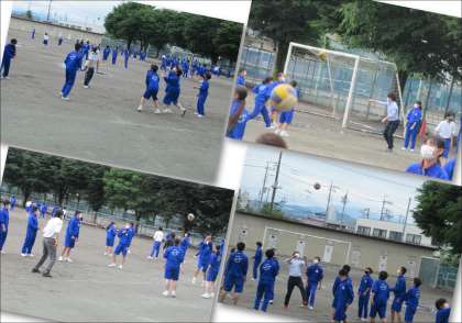 梅雨入りかのように雨の日が続きますが、雨が上がった昼休みの校庭では、生徒と先生が元気にバレーボールの練習をしています。ボールが逸れて水たまりに入ろうが、水気を払ってすぐに円陣バレーが始まります。清々しい光景です。