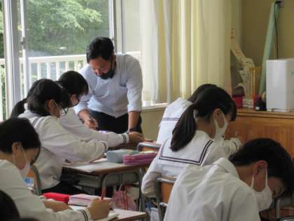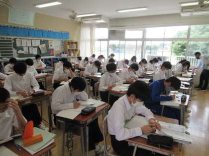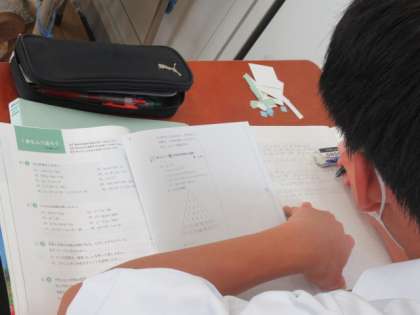 5月24日(月) 3年生の数学 公開日 2021/05/24 更新日 2021/05/24 できごと 因数分解の学習が終わり、今日は章末問題等に取り組んでいました。ノートや教科書を見返しながら、3年生は黙々と真剣に問題に取り組んでいます。先生は、生徒の間を回りながら適宜助言を与えたり、質問に答えたりしています。落ち着きのある空間で、どんどん学習がはかどっていました。