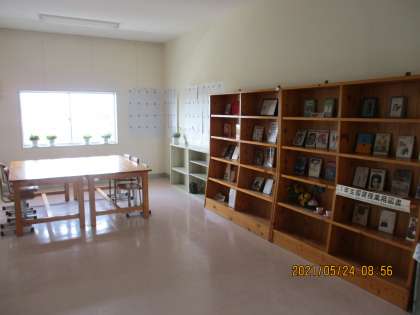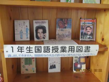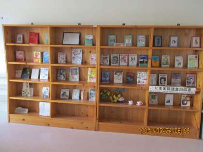 5月24日(月) 1年生のフロアの一角に 公開日 2021/05/24 更新日 2021/05/24 できごと 1年生のフロアの一角に1年生の国語の授業に関係する本「授業用図書」がたくさん紹介されています。教科書には、教材文しか掲載されていませんが、全文が掲載されている本だったり、同じ作者の本だったり、広く紹介されています。