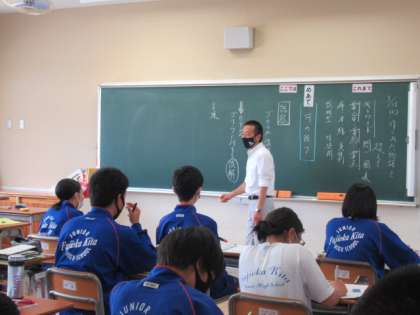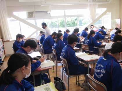 5月25日(火) 3年生国語の授業(1) 公開日 2021/05/25 更新日 2021/05/25 できごと このクラスでは、単元「作られた『物語』を超えて」の学習に取り組んでいました。野生動物の行動を、人間が都合のいいように解釈して「物語」を作っていることことを取り上げた内容です。今日の授業では、ゴリラに対する誤解は何かを作者の主張を手がかりに見つけ、書きまとめていました。考えさせられる題材に対し、真剣に取り組む生徒の姿がありました。