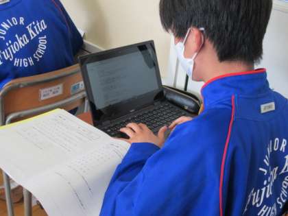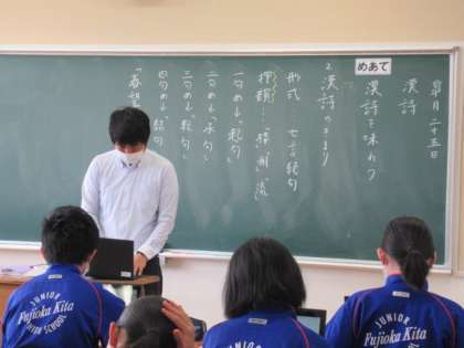 5月25日(火) 3年生国語の授業(2) 公開日 2021/05/25 更新日 2021/05/25 できごと このクラスでは、『黄鶴楼にて孟浩然の広陵に之くを送る』という漢詩を読み味わう学習に取り組んでいました。形式や押韻などについて学び、声に出して読み、作者:李白の心情を考えました。終盤には、Chromebookを使って李白について調べ、心情の裏付けを図るなどしていました。生徒のPC活用もとてもスムーズです。