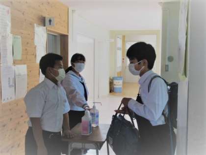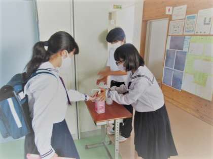 生徒玄関では、これまでも生徒会や生活委員会があいさつ運動に取り組んできました。前期人権集中学習の期間中は、人権を大切にする取組として“スマイルエアハイタッチ”を取り入れてあいさつ運動を繰り広げています。さらに、各階では階段を登り切ったところに生活委員会が消毒液を用意し、名付けて“スマイル手指消毒”を行っています。仲間たちもきちんと心得ており、サッと手を差し出して生活委員に消毒液をかけてもらいます。「おはよう」「ありがとう」の言葉も自然と出ており、朝の素敵な光景となっています。