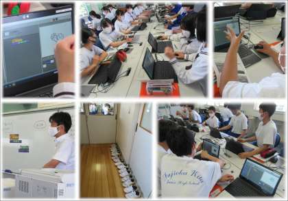 3年生の技術では、プログラミングを取り入れた学習に取り組んでいます。コンピュータにグーチョキパーを表示できるようにプログラミングし、自分と対戦できるようにしていました。表示されるグーチョキパーは、自分で描いた絵です。実際に対戦できるようになると、生徒たちは嬉しそうでした。中には、ちょっとここを変えようかな、と改善に挑戦する姿も見られました。生徒たちの柔らかな感性で、プログラミング学習もさらに進んでいくことと思います。