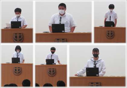 本日の5、6校時に体育館にて少年の主張校内大会を開催しました。感染症予防の観点から3年生は体育館、1、2年生は各教室にてオンラインによる参加となりました。