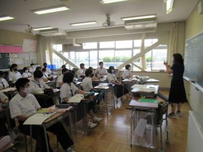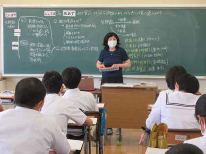 2年生の家庭科では、生鮮食品に続いて加工食品の選び方について学習しています。生徒は、既習の生鮮食品の特徴と比較しながら、加工食品の良さや問題点などを日頃の生活と関連付けて発言していました。加工食品について「家族はこんな点が心配と言っていた」などの発言もあり、授業と家庭生活の密接な繋がりを改めて感じることができました。