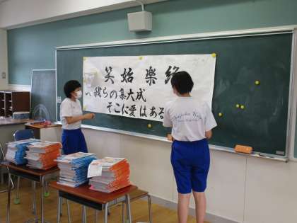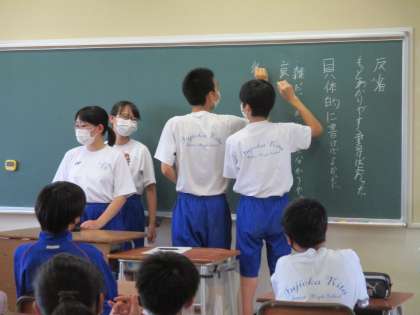 6月17日(木) 専門委員会(8) 公開日 2021/06/18 更新日 2021/06/18 できごと 体育委員会3年生の様子です。 球技大会のスローガンを作成していましいた。 いよいよ3年生は中学校生活最後の球技大会です。 このスローガンに向かってクラスの 下の写真は、広報委員会の様子です。広報委員会では、SDGSの取組を全校生徒が意識できるようにポスターを作成してくれ掲示してくれました。今日はそのことについて、更によくするための方法を考えていました。