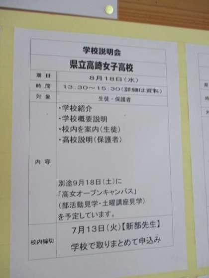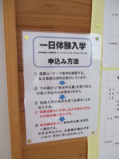 今日は、高校のオープンスクール「学校説明会」の連絡が学校毎にまとめられ、貼り出されました。