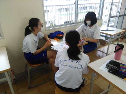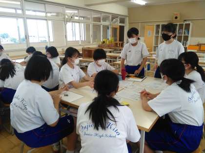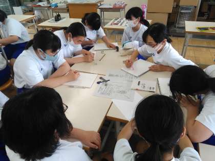 6月18日(金) 美術部 公開日 2021/06/18 更新日 2021/06/18 できごと 今年度の人権宣言の標語のテーマである「”認め合い””助け合い”は”愛言葉”」のイメージに合わせたイラストを、美術部がポスターにするべく、選定や練り直しを行い始めました。各学年で話し合いながら、アイデアを組み合わせてよりよいイラストを作ろうと頑張っています。