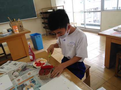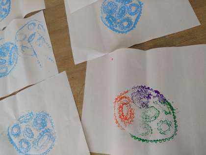 6月18日(金)波段ボール版画 公開日 2021/06/18 更新日 2021/06/18 できごと 造形活動として、事前に段ボールの片面を剥がしたものを、波状の部分が見えた細長い段ボールをくるくる巻いて、いくつもの波段ボールを詰め込んで版画にします。 今日は、個人個人の好きな色をローラーで塗り、半紙に写しました。2〜3色に分ける子もいれば、はっきり写るようにたくさんこすったりして活動を楽しんでいました。 次回は、みんなで詰め込んだ大きい波段ボールを写してみようと思います。