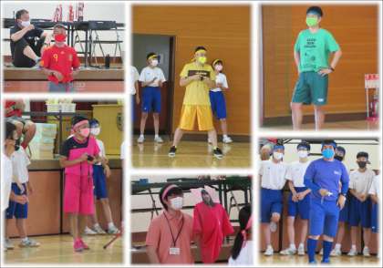 各クラスの担任の先生は、皆、クラスカラーの服を身にまとい、生徒の士気を鼓舞します。マスクも何とクラスカラーです。生活科学部の生徒たちが、この日のために心を込めて作ってくれたそうです(写真上)。学年主任や副担任の先生方も、生徒の一挙手一投足を熱い視線で見守っています。主任のマスクは、レインボーカラーです。学校の各種事務の補助や生活科学部への協力をしてくださっている方の手作りだそうです。