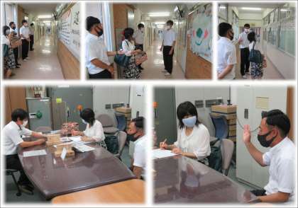 生徒会本部役員への取材の後、校長先生と生徒会顧問の先生が取材を受けました。北連携型小中一貫校としての教育活動や、保護者にも協力を呼びかけてSDGsの取組を進めていることなどの説明がなされました。