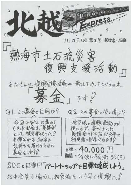 7月19日(月)までの短期間ですが、熱海市で災害に遭われた皆さんのために復興支援募金を進めていきます。