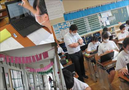 2年生の廊下には、七夕のような飾り物が風に揺れています。夏休みを前に、共に過ごしてきたクラスの仲間たちへの感謝の言葉をクラスカラーの紙に書き、飾ったのだそうです。読むと温かい気持ちになります。