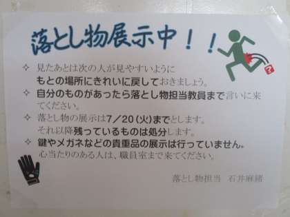 7月16日(金) 落とし物紹介 公開日 2021/07/16 更新日 2021/07/16 できごと 1学期、学校に届いた落とし物です。 東玄関の机に展示してあります。 心当たりのある生徒は、申し出てください。