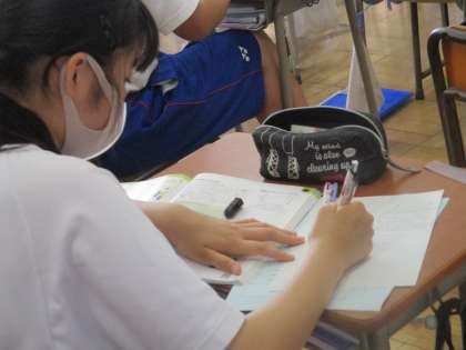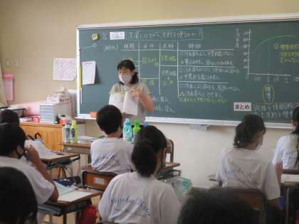 7月16日(金)1年生家庭科の授業 公開日 2021/07/16 更新日 2021/07/16 できごと 教科書をのぞくと、そのページには「めざそう洗濯名人」というテーマが。 今日は、「洗濯にはどのような洗剤を使ったらよいのだろうか」について、学んでいました。 夏休みには、家庭科の宿題として「洗濯」と「満点朝ご飯」にチャレンジしてください。