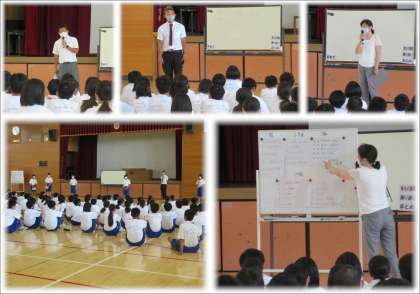 2学年集会の様子です。はじめに、各学級委員長がクラスの成果と課題について発表しました。どのクラスも“なるほど”と思われる感想が述べられ、さすがリーダーと思われました。先生方からは、夏休み中の学習と生活、そして1学期の総括について話がありました。繰り返し「学校の顔」「リーダー」という言葉があり、部活動や生徒会活動等において、先輩たちの後を引き継ぐことができるよう、この夏をしっかりと過ごしてほしいとの願いが込められていました。