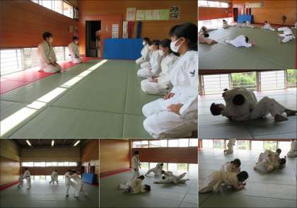 柔道部は、東中学校の顧問の先生、生徒、部活動指導員さんをお迎えして合同練習を行いました。畳の上で正座してあいさつをし、入念に準備運動を行い、細やかなご指導をいただきながら熱心に練習に取り組みました(写真上)。