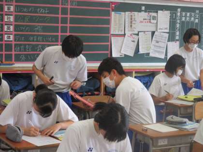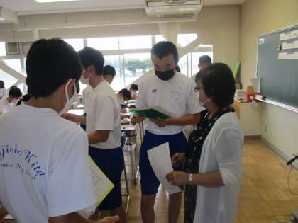 9月22日(水) 3年生英語の授業 公開日 2021/09/22 更新日 2021/09/22 できごと 3年生英語の授業の様子です。 I want 人 to 動詞の原形・・・ わたしは (人) に 〜 してほしい という表現を学びました。 英作文をしてから、近くの人やALT、先生と積極的にやりとりをしていました。