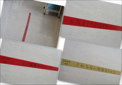 上ばかりを見ていて、気づきませんでしたが、下を向いて床を見てみると、右側通行をさせるように廊下の真ん中にテープが貼られていました。更によく見てみると、そのテープにもコメントが書かれていました。