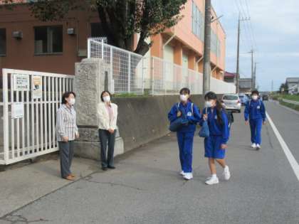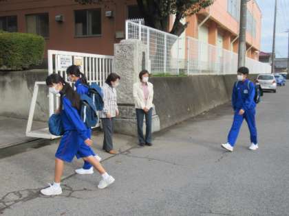 毎週月曜日は、更生保護女性会の方々が校門付近で生徒の登校を待ち受け、あいさつや声かけをしてくださいます。女性会の方々の温かい言葉がけにより、生徒は週のスタートを気持ちよく迎えることができていると思います。また、生徒からの積極的なあいさつに、「若い人たちから元気をもらえます」と女性会の方々も嬉しそうにしてくださいます。これからも、あいさつで気持ちの良い一日を始めたいものですね。
