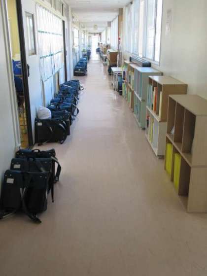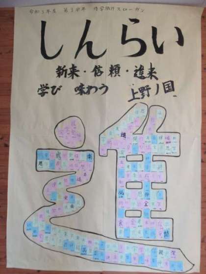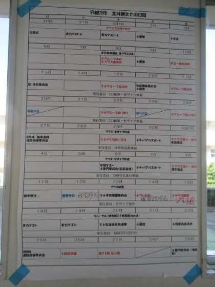 中間テスト実施中の3年生の廊下は、カバンが整然と並び、最高学年としての落ち着きが感じられます(写真上)。早くから掲示されていた修学旅行のスローガンには「上野ノ国」が書き加えられ、気持ちも新たに前へと進もうとする生徒たちの意気込みが伝わります(写真中)。また、北斗祭までの日程表も掲示されており、最後の北斗祭を成功させるための思いが詰め込まれています。