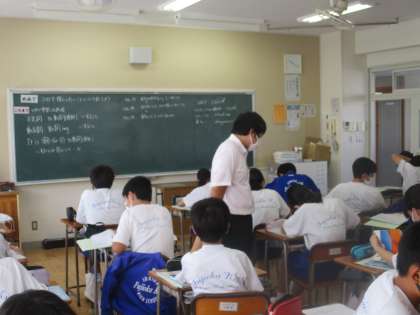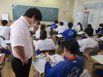 10月11日(月) 2年生英語の授業 公開日 2021/10/11 更新日 2021/10/11 できごと 10月11日(月) 2年生英語の授業の様子です。 今日は、本単元で習ったことを生かして、「自分が〜したいこと」を英語で表現しました。コロナウイルス感染症が感染が終息した後にやりたいことについて、まずはワークシートに英文を書いていました。