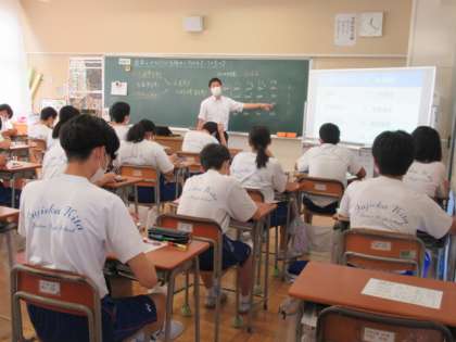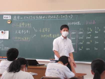 社会では、選挙の仕組みについて学習しています。小選挙区制と比例代表制など、複雑な内容ではありますが、数年後には生徒自身が投票に直接関わるわけですから、皆とても真剣に聞き、それぞれの仕組みの特徴と、並立して行われる意味などを考えていました。