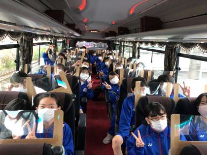 無事に出発しました。1組1号車はみんな楽しみでニコニコです。 天候は不安ですが、楽しんできます!
