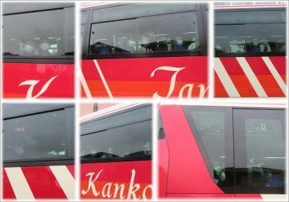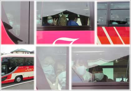 3年生が修学旅行に出発しました!出発直前のバスから元気に手を振る3年生です。くもりガラスの向こうに晴れやかな表情で手を振る3年生!誰だか分かりますか?元気に行ってらっしゃい!!