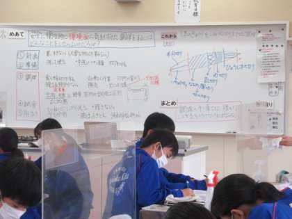 家庭科では、感染症予防に十分留意する中で可能な実習を模索し、今後は1本のキュウリのいろいろな切り方を習得して調理する予定です。今日の授業では、安全に衛生的に環境面に気を付けた調理をするためにはどうしたらよいか、既習事項や生活体験をもとに考え、共有し、まとめました。今週からは、技術・家庭科担当の教育実習生が授業を参観し、来たるべき授業に備えています。先生も、生徒も、実習生も一生懸命授業に取り組んでいます。