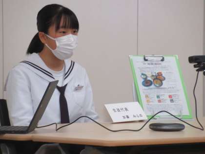 生徒代表は、「満点朝ご飯レポート」3年の部で見事金賞に輝いた生徒です。日頃から意欲的に取り組んでいるSDGsを取り入れた食事作りに、“3R”の視点をもって臨んだ素晴らしい実践発表でした。
